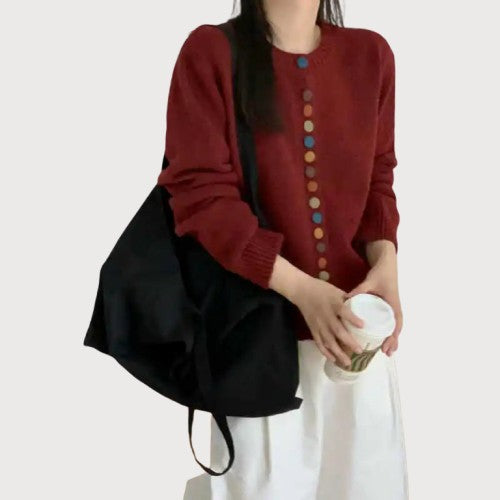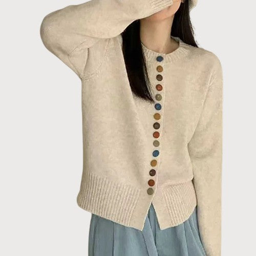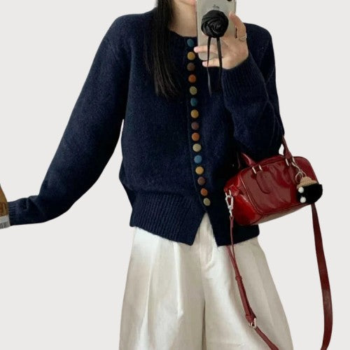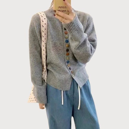 - Charming Button Detailing – A row of multicolored buttons brings personality to a classic knit.